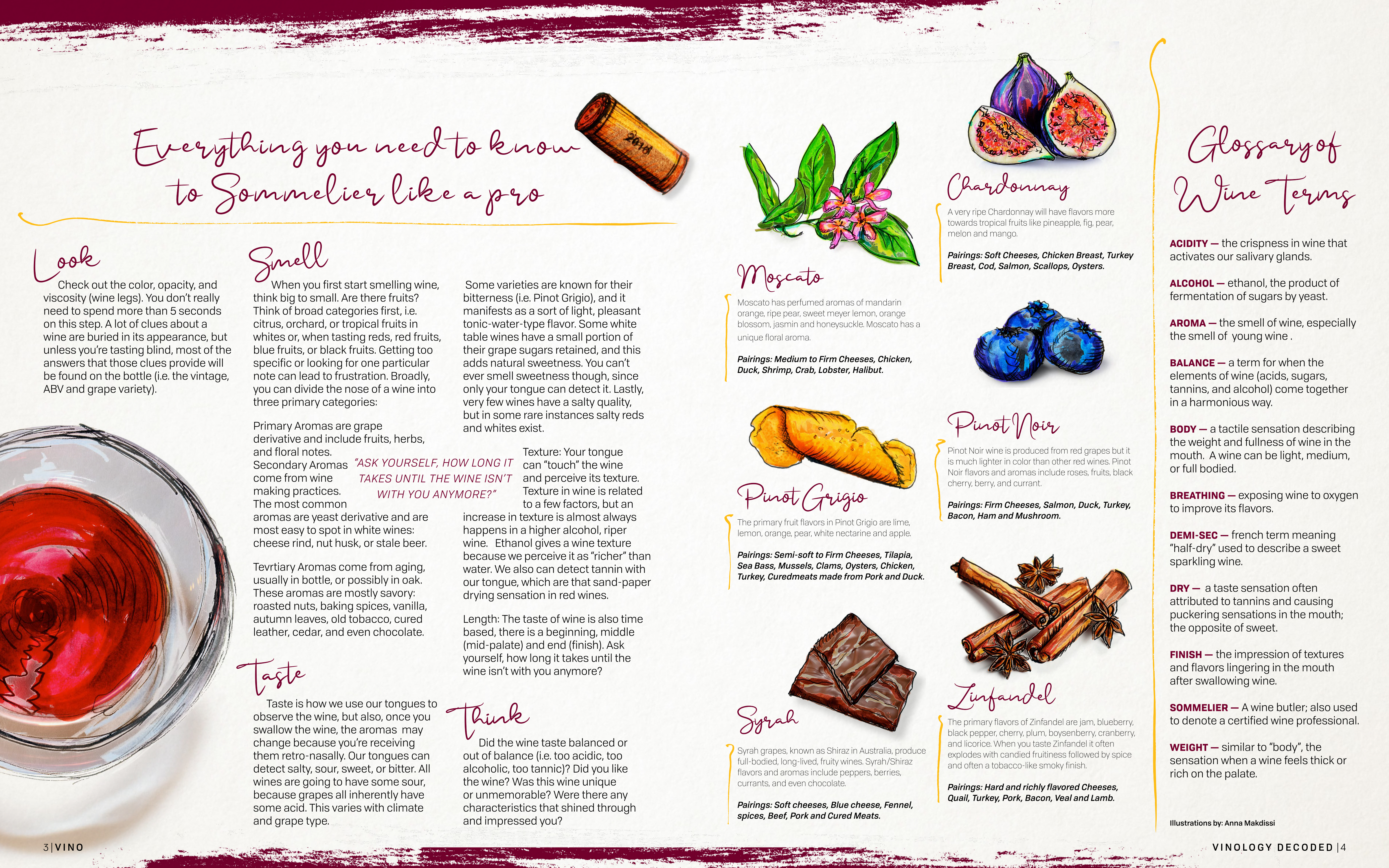 This double-spread feature article was designed for the How-To category of the Society of Publication Designers student contest. This article is everything you need to know to sommelier like a pro. It focuses on the steps of wine tasting, different kinds of wines, aromas and the correct terms to use.